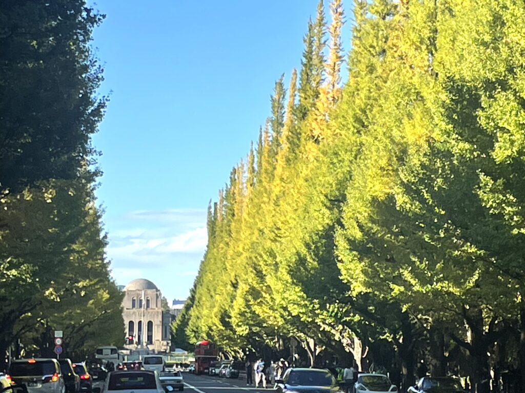 今日帰りに、ギャラリーからすぐの明治神宮外苑の銀杏並木に立ち寄ってみたら、黄色く色づき始め多くの人でにぎわってました。